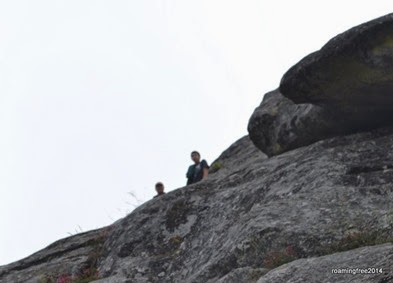 Bryce was determined to climb to the top of the rock, so we started up, despite the clouds. It was definitely steep, and clouds kept rolling over the rock . . . and the higher we got, the windier it became!