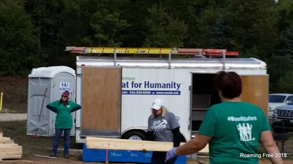 The RV CAV coordinator gave us the option of cancelling, but we wanted to go and the Habitat Coordinator assured us that we would not be working alone. They had several corporate groups signed up during that time period, and there were local volunteers who work on builds on a regular basis. We arrived on Sunday afternoon and got set up at the KOA. Normally, they have a kickoff dinner on Sunday night for all the RV volunteers, but since it was just us, we met with Mandy, the Habitat Coordinator, at a local restaurant. She treated us to dinner, and gave us some information on Habitat of Northwest Michigan, the current builds they have going, and our schedule for the next 2 weeks. Tom was working everyday, but I just had 2 days/week to participate – Wednesdays and Fridays. She was OK with that, so this would work out pretty well. They currently have 3 build sites in progress. The first is Alanson, MI which is just about 7 miles north of the KOA. They are building a small subdivision at that site, with two houses already occupied, one nearly done, and one new house with just the foundation in place. That was supposed to be our primary site, weather-permitting, and that’s where Tom reported for work on Monday morning. He was working with a group of women from the Stafford Hotel Group, and their chef was sending lunch to the build site – that was a nice little bonus. The lumber was getting delivered just in time. They worked on getting the sill plates and walls laid out. Tom said they were a fun group to work with, and he had a good time. On Tuesday, he was back at the same site with a group of local men, and they put the walls up. They made some really good progress in two days! On Wednesday, we were both scheduled to work and it was projected to rain all day – heavy rain. The site supervisor, Larry, had us meet him at their Boyne Falls build site, which is about 20 miles south of Petoskey. There is just one house under construction there, and it’s almost complete. They are just finishing up interior trim work. We reported to the basement, where we painted interior doors . . . or I should say I painted interior doors. Tom painted one . . . and I fired him from painting! From then on, he did the prep work for me – removing hardware, filling little holes and scratches, and sanding. I painted 9 additional doors. It wasn’t hard work, but standing on concrete all day was rough on my legs, and I was ready to stay home and work my desk job the next day! Tom reported to the 3rd build site on Thursday, Boyne City, where the crew was sheeting the roof of one of two houses that are going up concurrently. Friday was a busy day, and we would be working with a crew from Lowe’s to get the exterior insulation on that same house. We worked our way around the house . . . and got three sides covered. That was quite a bit of progress in one day! It was a chilly day, but at least we stayed dry! Week 1 was complete, and we were ready for the weekend off! The following week started out warm but a little rainy, and Tom spent the first couple days working with Larry on some finishing touches in the Boyne Falls house, and picking up supplies for the Boyne City houses. On Wednesday, we were back in Boyne City. Tom and I picked up donuts for the crew of local volunteers, and we enjoyed the spectacular view of the colors changing as we made the drive from Petoskey to Boyne City. So many beautiful views along the way! No wine for the build site, though! It was a beautiful day on Wednesday – actually hot, but we had a nice breeze all day. Tom and a few guys finished up the insulation on the last side of the same house, and I worked on mudding the foundation of the 2nd house, while a few other guys prepped for the roof trusses to be installed the next day. On Thursday, Tom was back with most of the same crew to get the roof trusses set on the 2nd half of the house. It was a windy day, but they got it done! Friday was our last day, and it was a cold & blustery one! They guys were putting roof sheeting on the trusses, but I kept myself busy inside the other house for as long as I could. There was a bunch of sand and leaves on the floor, and wood strewn all over the place, so I spent my time sweeping and organizing . . . and staying somewhat warm – or at least out of the elements! Looks much better! It was a rewarding two weeks, and I’m glad we signed up for it. I think Tom enjoyed having something else to do while I worked, too. We’d definitely do it again, but hopefully if they have another in northern Michigan it’ll be a little earlier in the season – maybe September! We’ll look for builds in other areas of the country, too. Check out the website if you’re interested – they have builds all through the year, at many different locations.